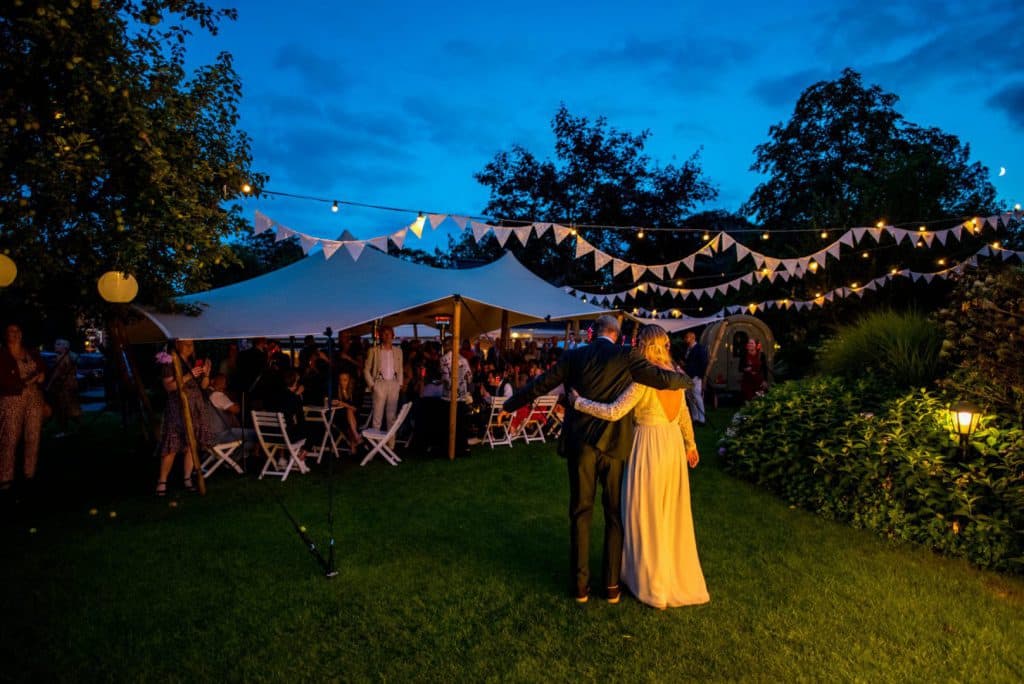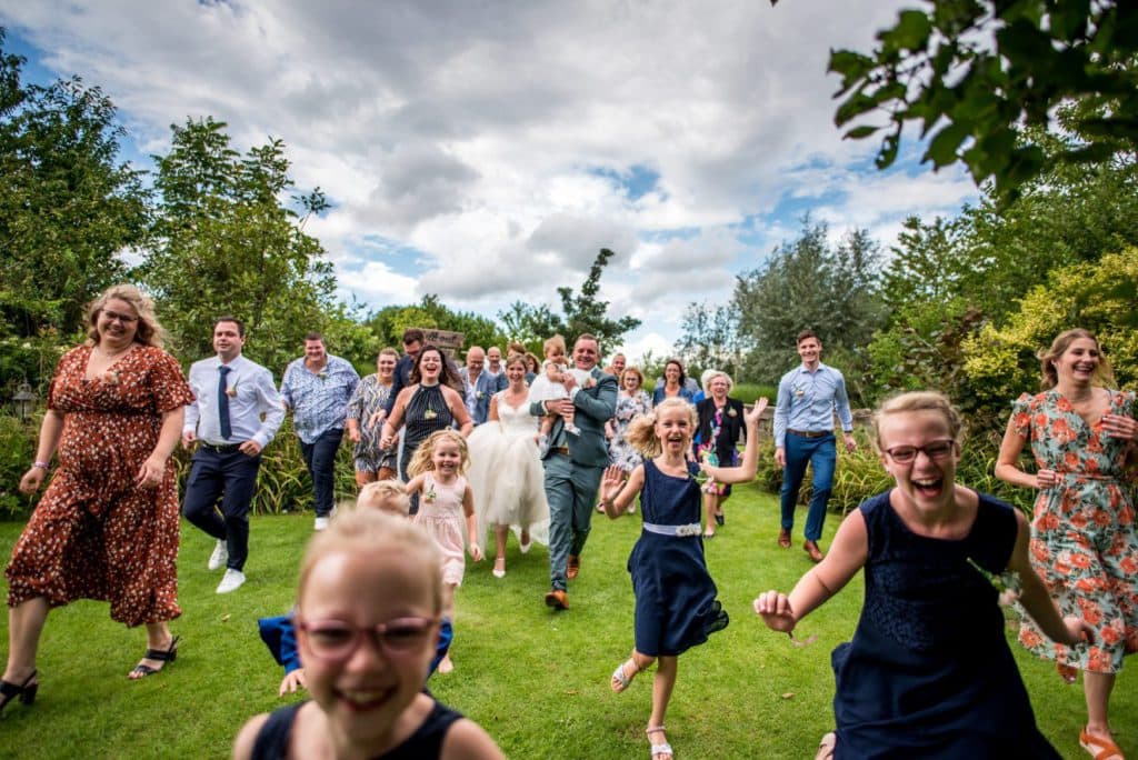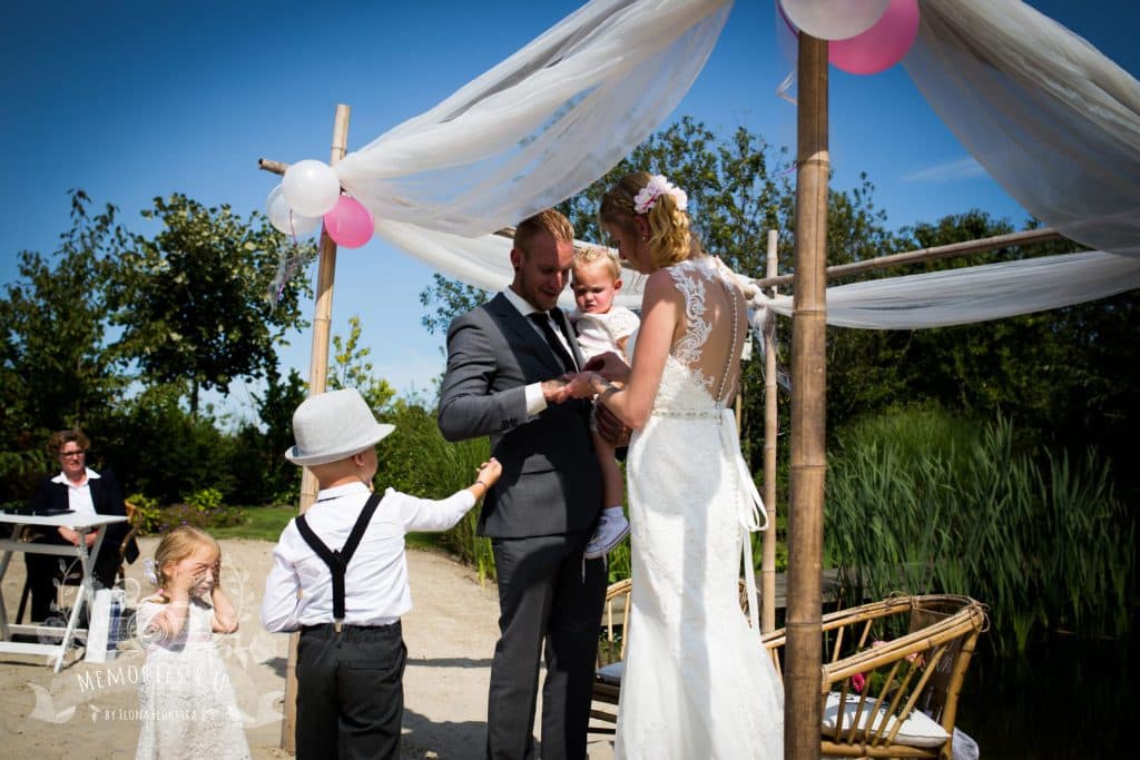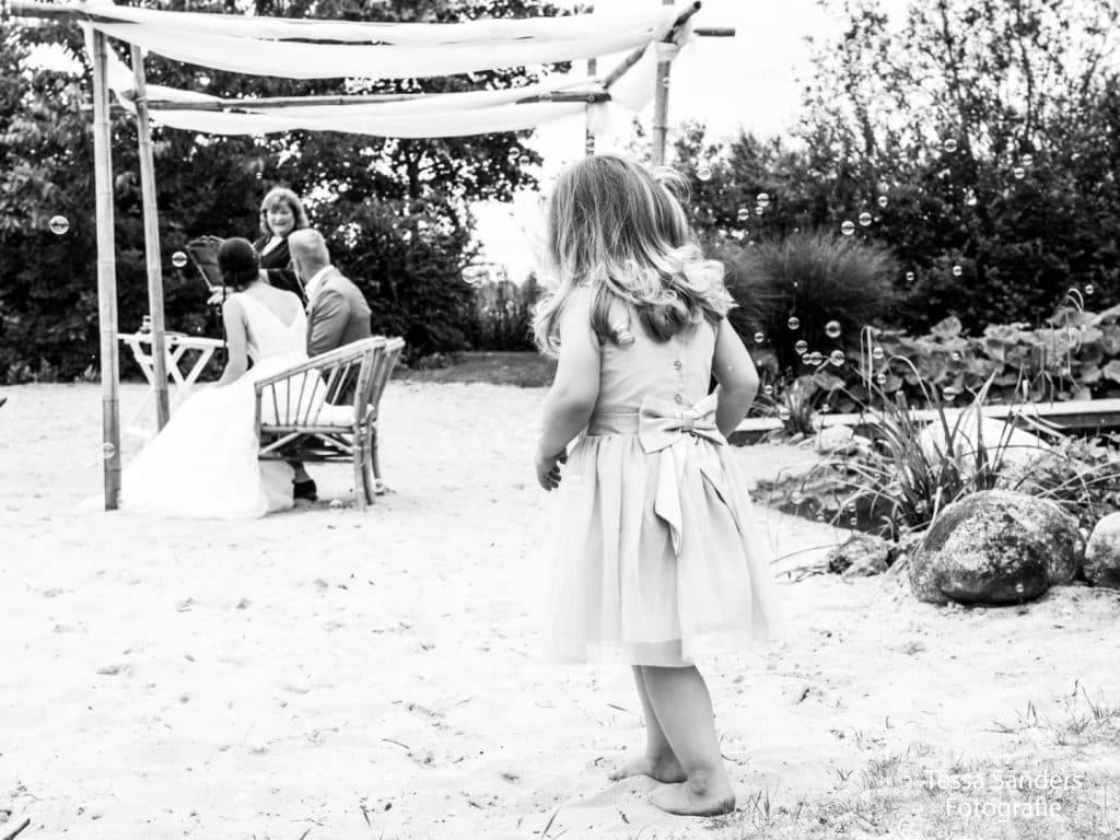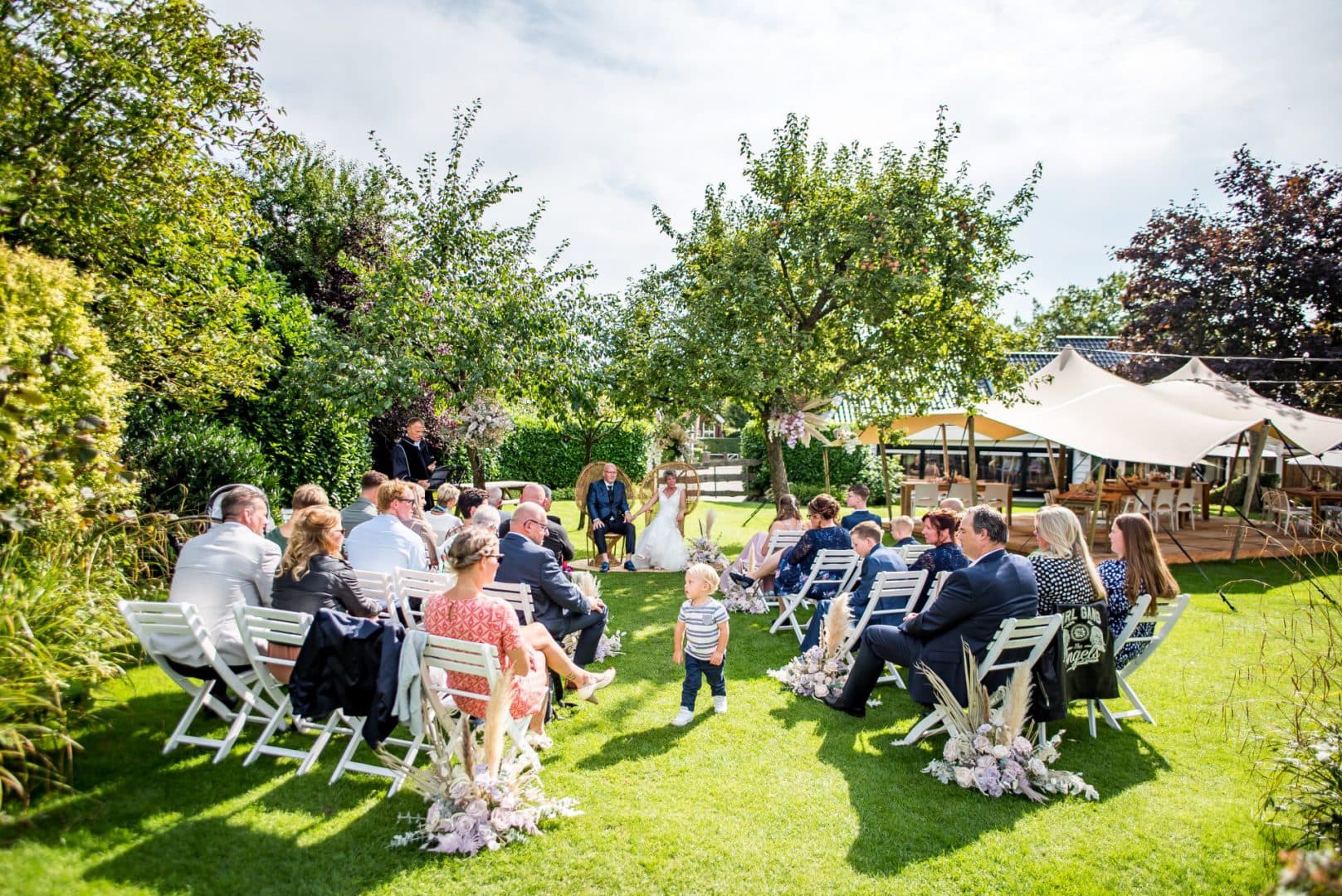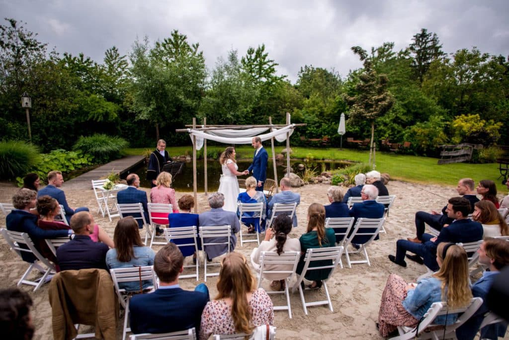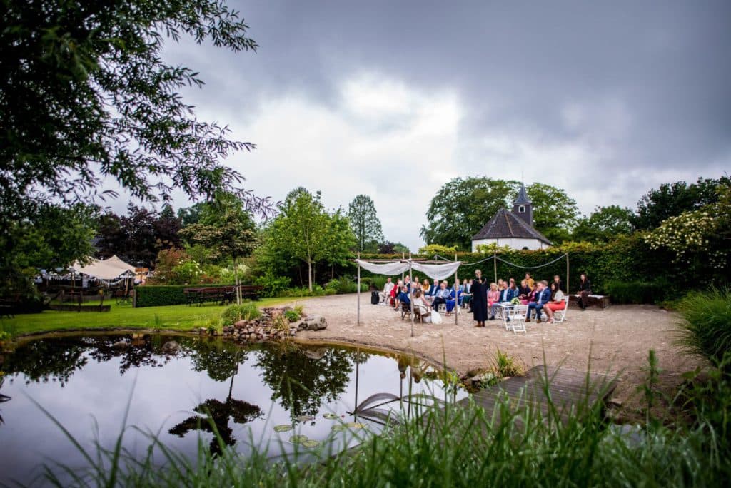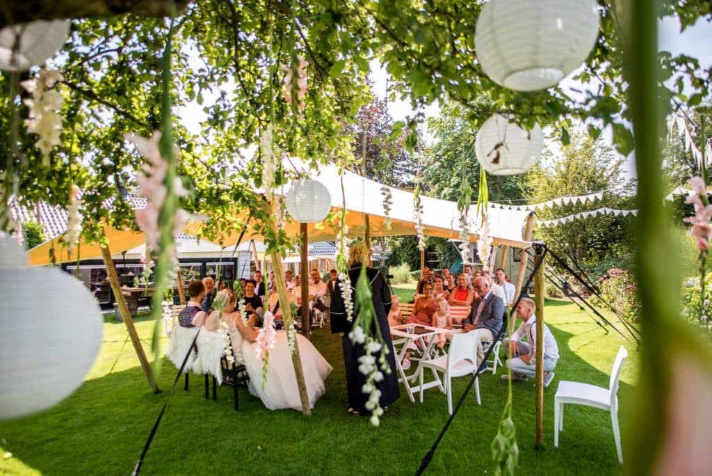 We kunnen de opstelling voor de ceremonie in overleg met jullie klaar zetten met stoelen naar eigen keuze. In de besloten tuin kunnen kinderen lekker hun gang gaan en tussendoor in de boomhut spelen. We kunnen muziek voor jullie draaien en na de plechtigheid bijvoorbeeld prosecco serveren. Bij minder goed weer kunnen we de ceremonie verplaatsen naar het overdekte tuin terras.