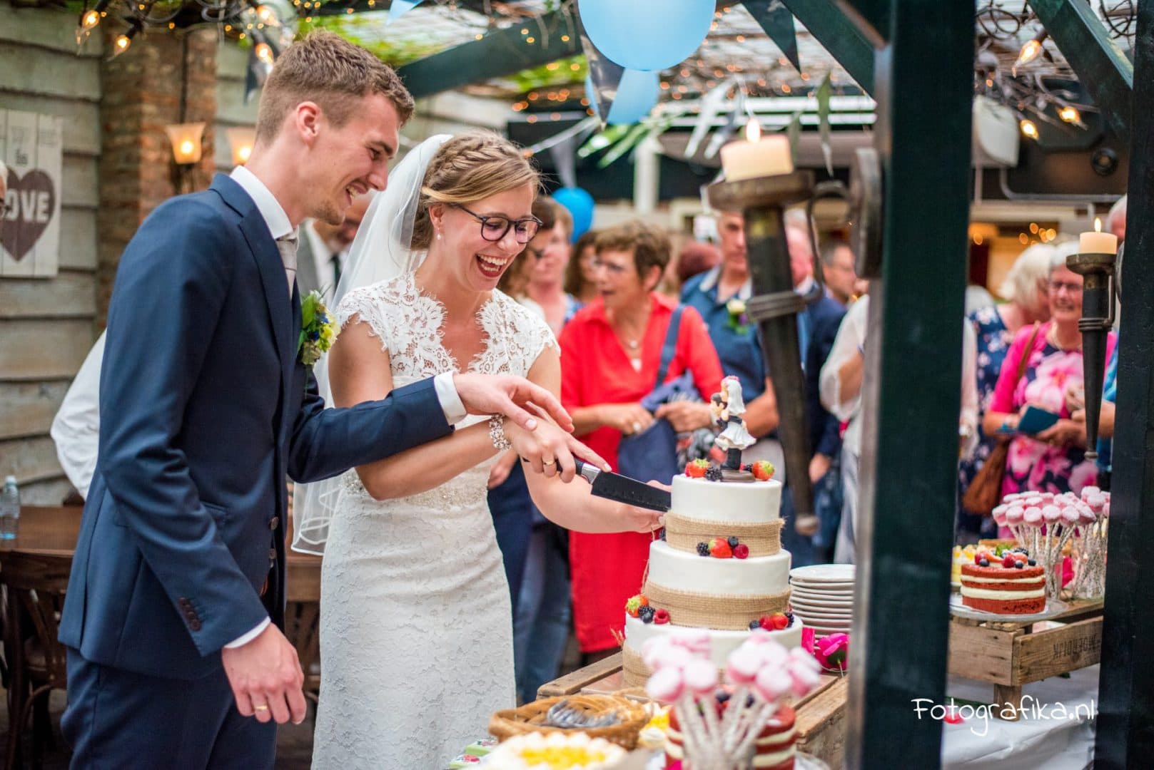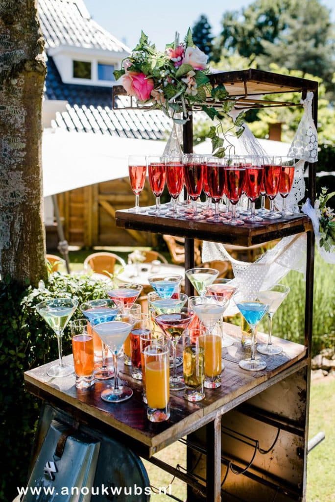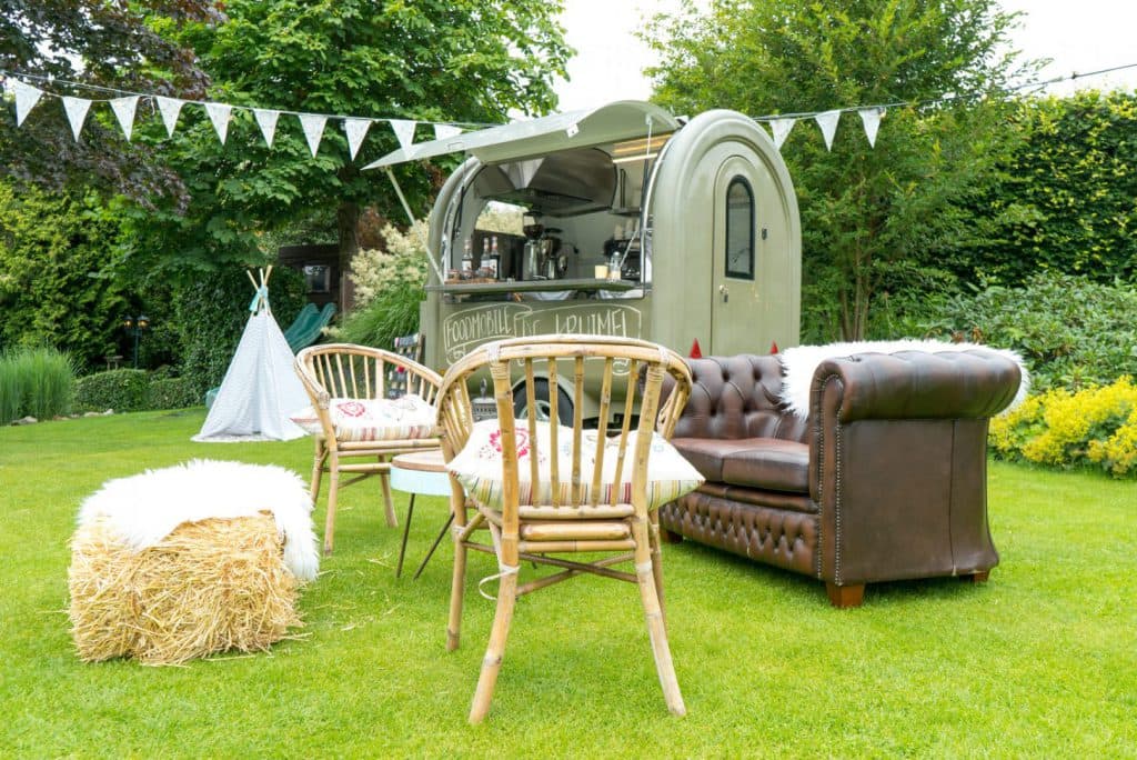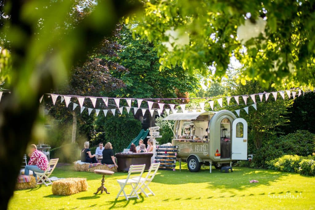 De hele dag door lekkere hapjes en drankjes geserveerd uit food trucks. Een buffet van zelfgemaakte taarten, chesterfield bankjes, strobalen en love-letters in de tuin. En natuurlijk kleedjes, vrolijke slingers, leuke festival borden, bistro stoeltjes en een oude bakfiets omgetoverd tot een rollende keuken. ’s Avonds een swingende band of een trendy DJ.